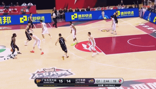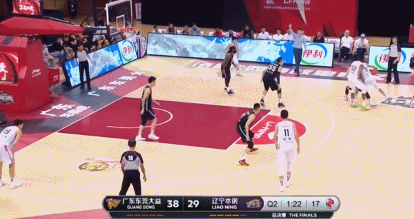 再説回進攻。郭艾倫和朱榮振的擋拆沒有效果,按正常安排,和他一組的梅奧應當承擔起戰術發起的任務。但這一場梅奧的攻擊慾望不強,手感也相當不好,在大部分比賽時間內他只得4分。從下面這個配合可以看出,當郭艾倫把球權讓給梅奧以後,效果同樣很差,原本應該擋拆攻筐,變成了付豪到籃下對周鵬一打一,這就是廣東用防守讓遼寧隊放棄了強勢點,去打自己不擅長的東西。