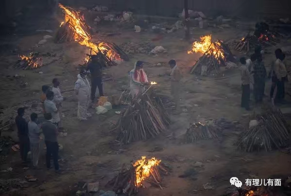 以印度總理莫迪老家古吉拉特邦的火葬場為例,其24小時運轉,部分火化爐的煙囱、鐵架在長時間高温下熔化崩塌,因為根本沒有時間冷卻。能進火葬爐的病亡者是運氣好的,到了後來火葬場負荷不過來,只能露天火葬。再到後來,連燃料也不夠了,火葬場要求家屬必須自備木材才能進。