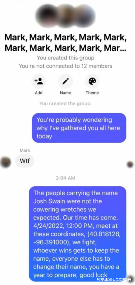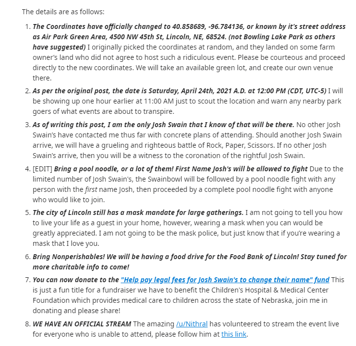 -沒錯,2021年4月24日中午12點,我們約在這(40.8223286°N 96.7982002°W)打一架,獲勝者就可以繼續用Josh,其他人改名,一年的時間準備,祝你好運。