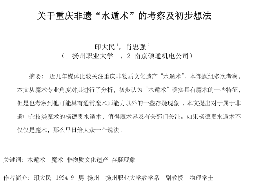 2011年,印大民在各地教學中發現了楊德貴這個人。並且,印大民表示經過他的仔細考察,認定楊德貴的**“水遁術”不是魔術,而是特異功能**。