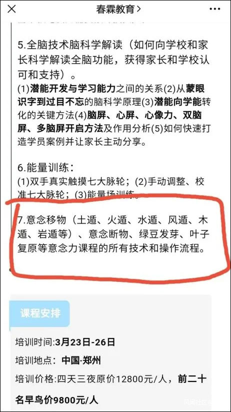 隨後,又有網友扒出其“能量訓練課程”的具體內容,比如號稱自己可以進行土遁、火遁,該課程培訓四天三夜,收費超過1萬元。