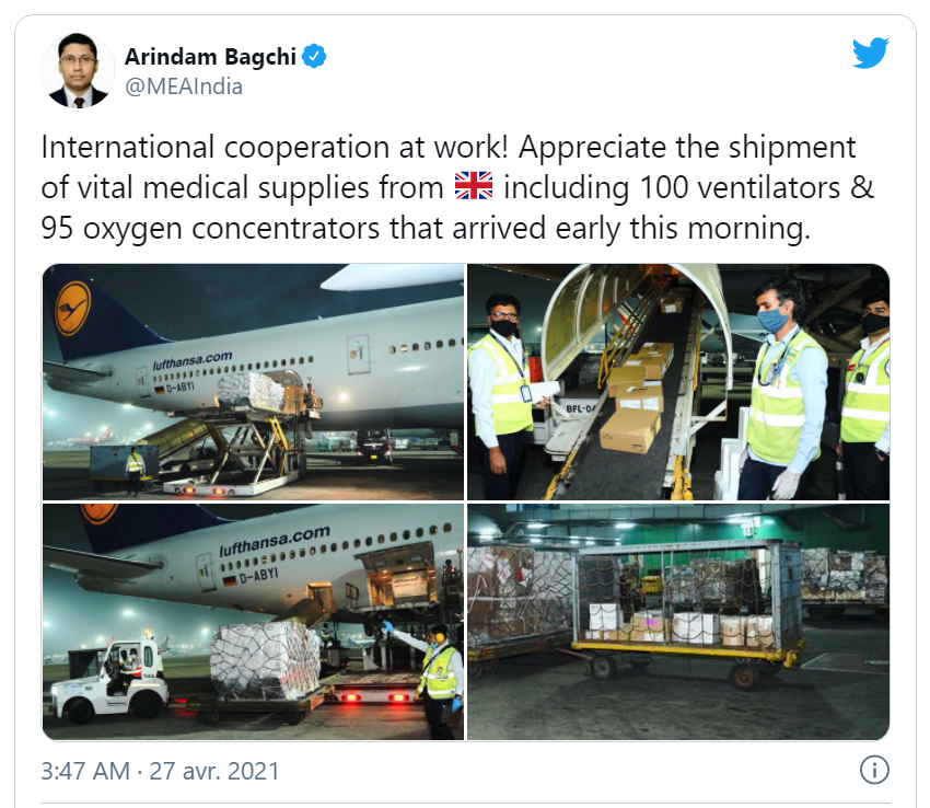 英國的第一批醫療設備和氧氣已於本週二早上抵達印度。工信部發言人阿林達姆·巴基(Arindam Bagchi)在推特上發佈了正在卸貨的照片,稱讚這是“國際合作”的好例子。