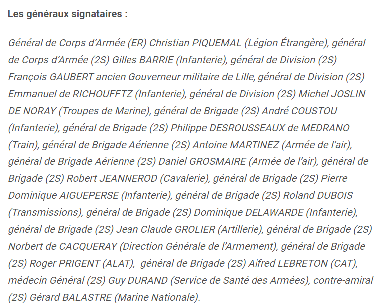 這份信指出了法國社會的墮落,信中表示:“法國正處於危險之中,眾多危險威脅着她。即使我們退役了,我們仍然是法蘭西的士兵,無法在目前的環境下,對我們國家的命運漠不關心。”
