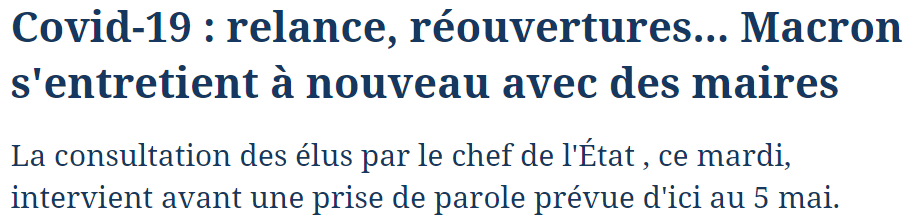 愛麗捨宮宣佈,就像3月和4月中旬一樣,伊曼紐爾·馬克龍(Emmanuel Macron)將於4月27日星期二通過視頻會議與十二位市長再次會面,討論健康危機的管理,疫苗戰略,重新開放的前景和重新開放的計劃。