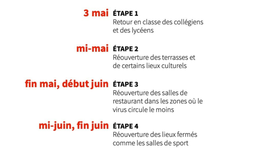 法國總統伊曼紐爾·馬克龍(Emmanuel Macron)在前往Melun (Seine-et-Marne)的時候,提到了重新開放的時間表,大概分為四個階段。