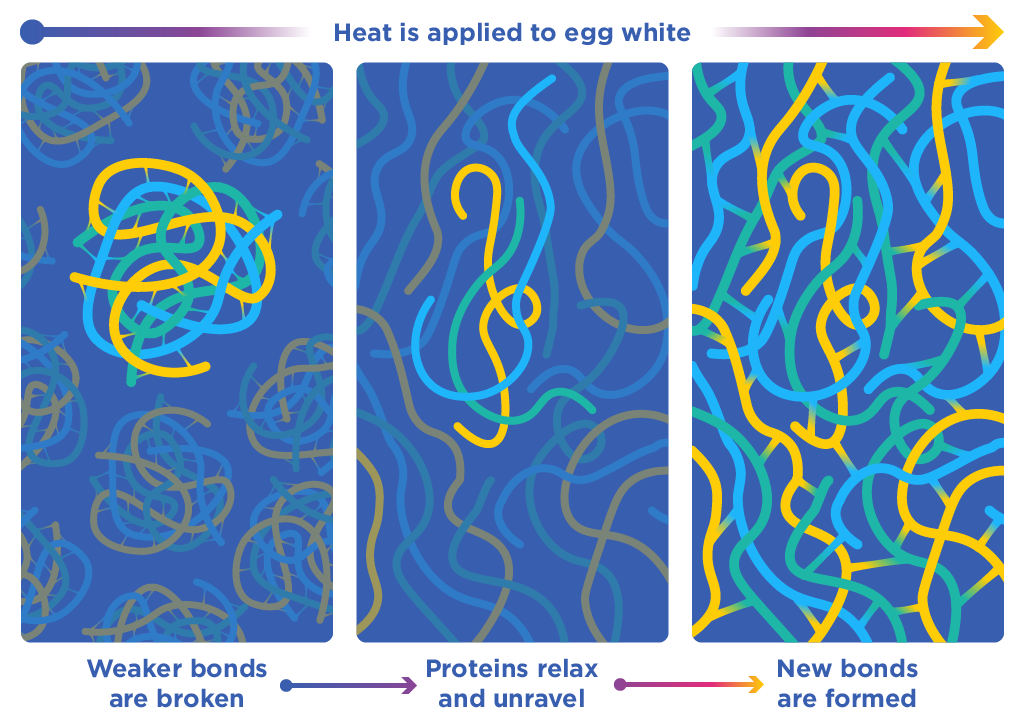蛋白質是由多肽鏈(氨基酸連成的長鏈)連接摺疊而成,要發揮特定功能,它需要保持特定的三維結構。然而,多肽鏈之間的連接(二硫鍵等)並不太牢靠,加酸、鹼或加熱都會將其破壞,打亂蛋白質分子結構,和周圍的蛋白質分子纏成亂麻。雞蛋清凝固成蛋白就是蛋白質在加熱條件下變性的過程。