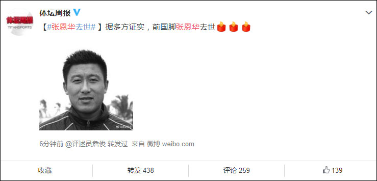 據國內多家媒體29日下午報道,前國腳張恩華去世,年僅48歲。