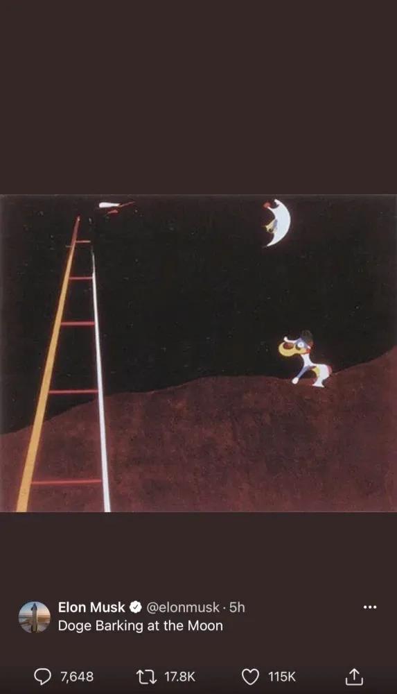 柒財經注意到,4月15日,加密貨幣交易所Coinbase上市第二日,馬斯克發推文稱,“Doge(狗狗幣)Barking at the Moon”,並附上相關圖片。