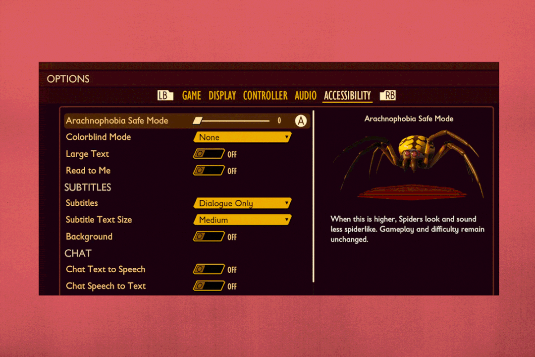遊戲在搶先體驗階段收到了不少反饋,其中就有玩家希望官方能為蜘蛛恐懼症者作出改動,因為在微縮尺寸的人類角色下,蜘蛛的外形結構看起來實在是清晰得有些可怕。黑曜石隨即加入了一個調節選項“Arachnophobia Safe Mode”(蜘蛛恐懼症安全模式),玩家可以切換1-5檔的蜘蛛形象,從完整狀態到簡化為僅剩頭、腹兩段。