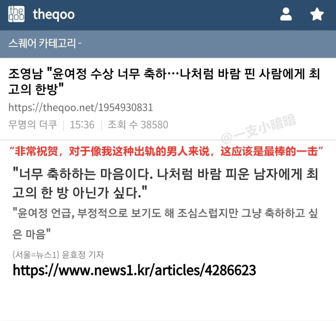 「她獲獎是對出軌男人最棒的一擊和復仇,作為出軌當事人的我,以後會更加小心。」