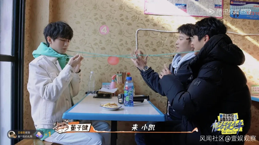 正是基於這樣的友誼,才讓三人的互動更接地氣、更真實,也能產生更多的火花。於是,劉昊然想睡覺,董子健和王俊凱會放歌、唱歌等來“打擾”;衞衣帶子長了,乾脆三個人圈在一起翻花繩……不生氣、不尷尬、快速進入狀態,相同的笑點、相似的“腦回路”,那些朋友間的默契和糗事、近乎無顧忌的聊天、逗趣所帶來的快樂等,成為梗之餘,也在吸引觀眾,引起共鳴。