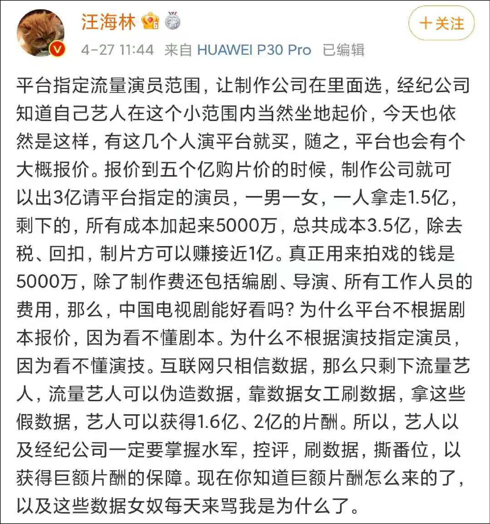 4月27日,@汪海林 發文談及“流量藝人拿天價片酬”一事,解釋了互聯網平台、影視製作公司、經紀公司、粉絲四方的運作機制。
