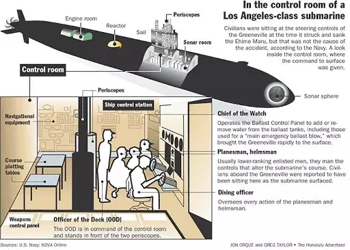 2001年2月9日美國海軍“格林維爾”號攻擊核潛艇(“洛杉磯”級)在距離瓦胡島僅16公里的水域進行緊急上浮演練,當時艇上載有16名民間貴賓,這是按照海軍DVE - 傑出訪客登艦計劃進行的一次公關活動,旨在向民間意見領袖展示核潛艇部隊的能力,爭取對海軍的支持和贊助。在出航前艇長斯科特·沃德爾中校被告知指揮艙內的AVSDU模擬視頻信號顯示器無法工作,也就無法顯示三部聲納的信號,因為執行的是非作戰行動而且就在近海,艇長決定忽略這一故障。