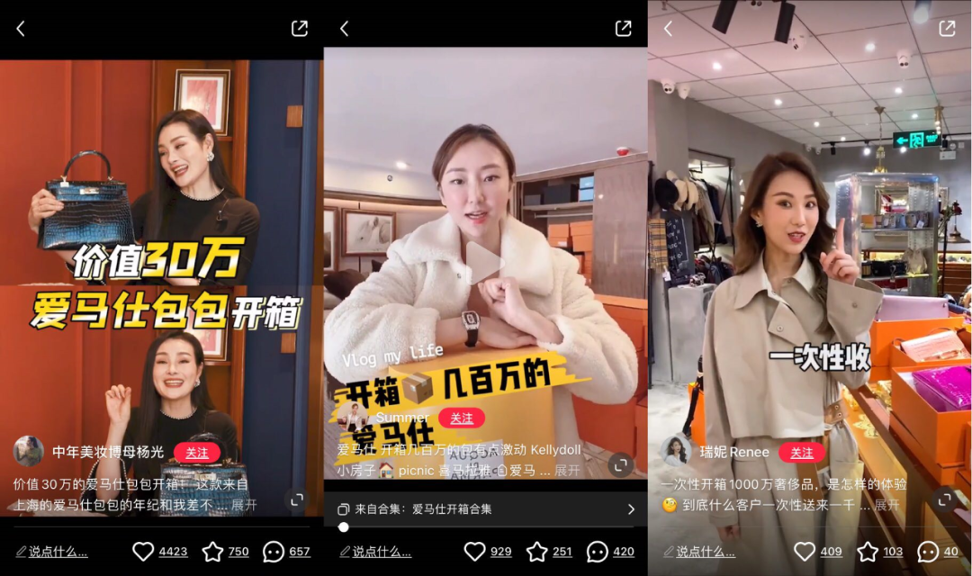 如今,炫富內容依然在小紅書上展現出了旺盛的生命力,堪稱野火燒不盡,春風吹又生。在小紅書上搜索“開箱”,展示出的便是類似“價值30萬愛馬仕包包開箱”、“一次性開箱1000萬奢侈品”的內容。