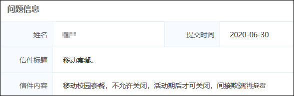老人的家人劉先生回家後非常生氣,於是根據原有號碼打回去發現根本打不通,隨後致電移動客服,客服表示,“活動無法取消”,該客服還再一次向劉先生“推薦”該套餐,稱“她參加活動的話,前兩個月返20,相當於扣費還是按照39來扣的。”