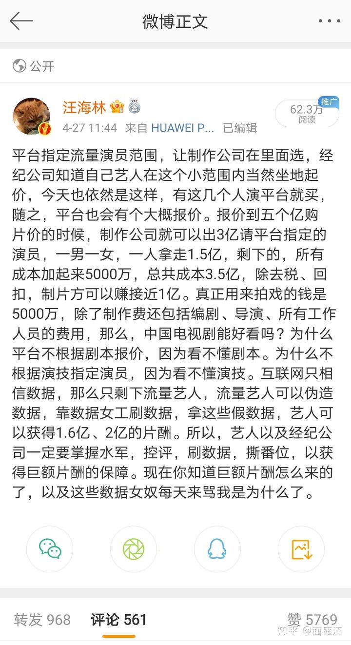 早在2016、2017年前後我就説過,我認為明星拿高片酬是正常的,全世界都這樣,但,行業整體虧損的情況下,不僅不共度難關,還逆市漲價,尤其一部戲拿到上億,是罪惡的,會有報應的。