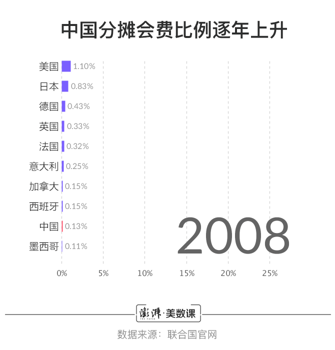 根據聯合國公佈的最新的2019年至2021年各成員國會費分攤比例預算,中國的分攤比例(12.01%)排名超過日本(8.56%),升至第二位。雖然繳納了高昂會費,但目前我國在聯合國等重要國際組織中,任職人數仍然較少。
