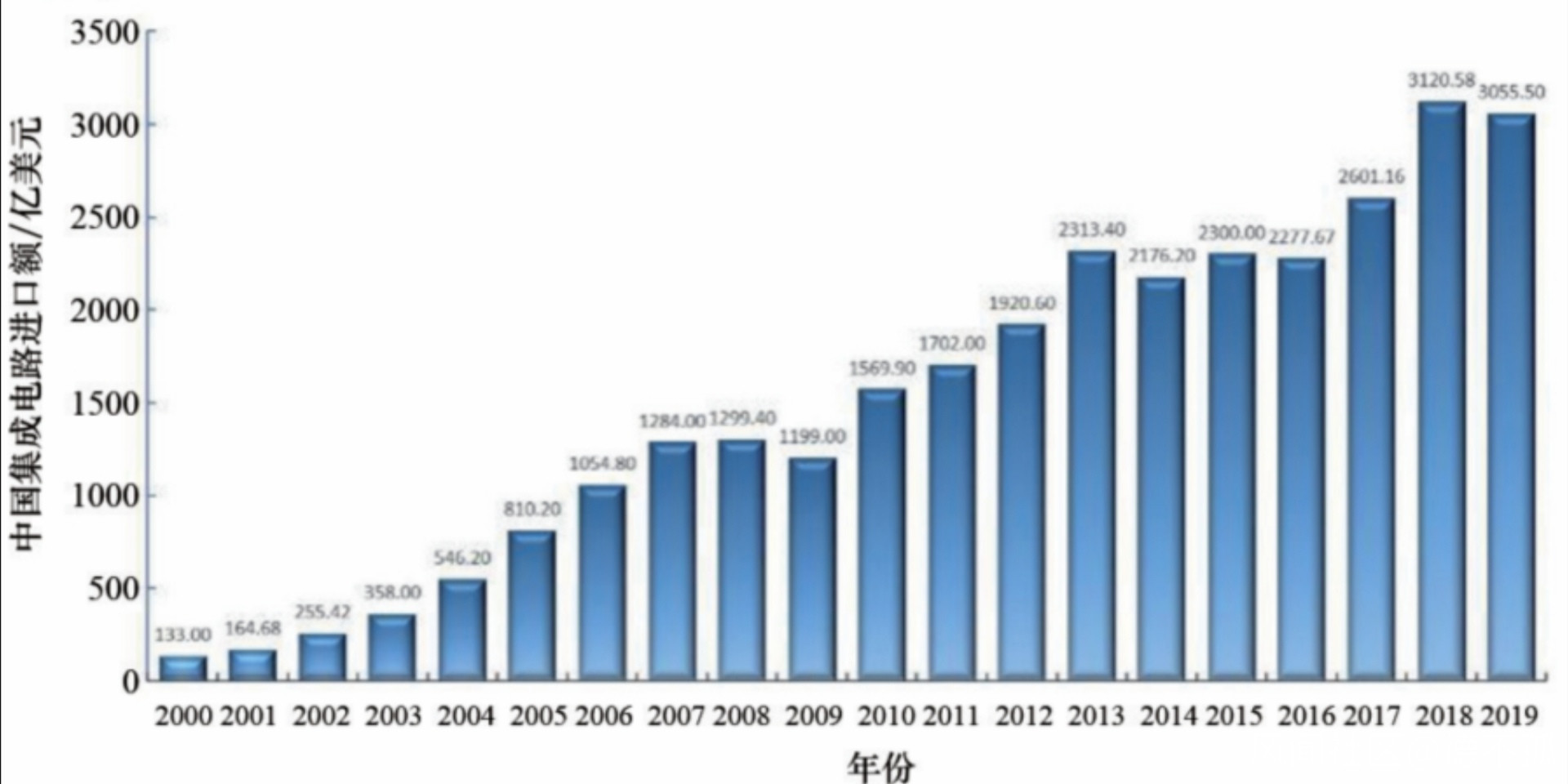 進口微處理器/控制器(佔世界半導體產品市場11%)的金額從2014年的1052.2億美元增長到2019年的1437.7億美元,增加了385.5億美元,增長比例為36.6%。