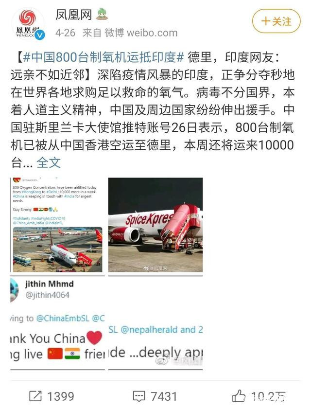 4月26日,800台製氧機已由中國順利運到了印度,但這只是開始,一週內還將有萬台製氧機送達。
