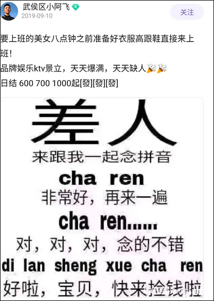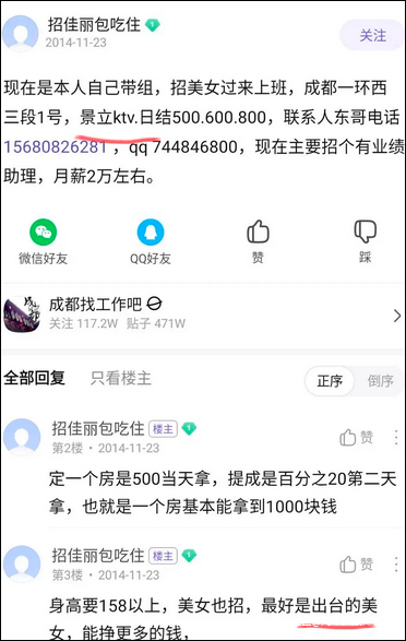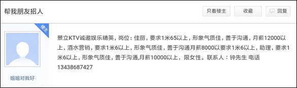 例如,2019年9月,有網名為“招佳麗包吃住”的賬號在“成都工作吧”發帖稱,景立KTV“招美女過來上班”,並在評論區補充道“最好是出台的美女”。