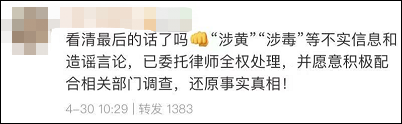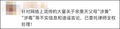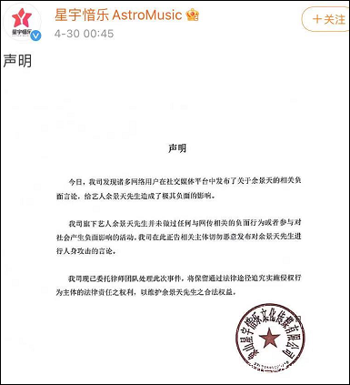 30日凌晨,餘景天的經紀公司星宇愔樂發聲明,稱餘景天並未做過任何與網傳相關的負面行為或者參與對社會產生負面影響的活動。公司將保留通過法律途徑追究實施侵權行為主體的法律責任之權利,並將委託律師處理此次事件。