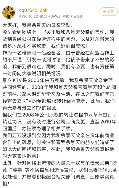 30日上午10點,微博賬號@cq8764512發博稱自己為餘景天的母親李勤,並表示,在2008年他們帶着餘景天哥哥前往加拿大温哥華後,就已經轉讓了景立KTV的全部股份。但當時只是簽訂了轉讓協議,沒有及時進行工商變更。