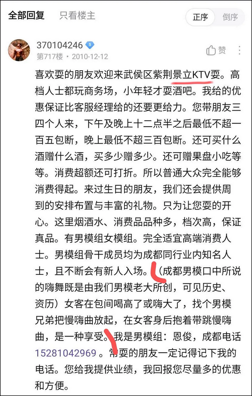 還有一名網友提供的圖片顯示,有人在貼吧稱歡迎來“景立KTV耍”,自稱是一名“男模”。“女客在包間喝高了或嗨大了,找個男模兄弟把慢嗨曲放起,在女客身後抱着帶跳慢嗨曲,是一種享受。”