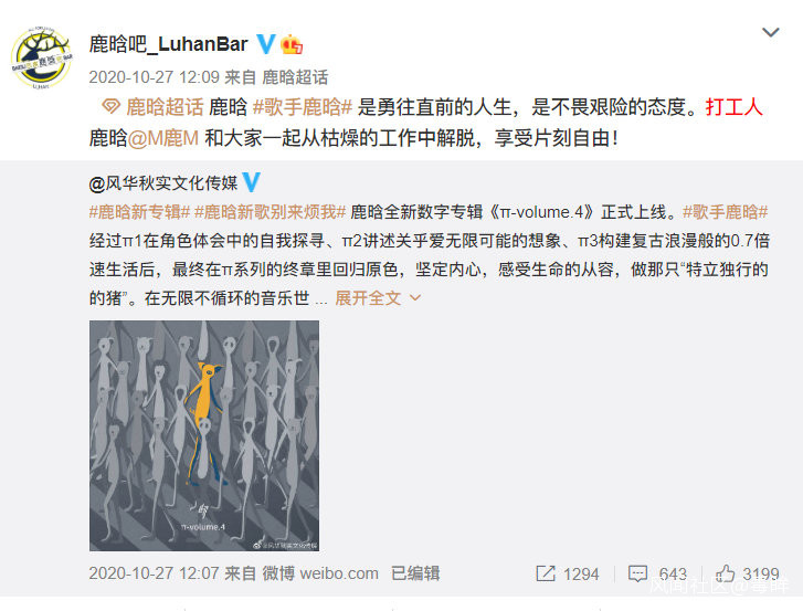 鹿晗也曾多次徵用這一詞語。在鹿晗去年參演的綜藝《哈哈哈哈哈》中,他與鄧超、陳赫等明星需要通過做短工來賺取費用。或許是為貼合此設定,在綜藝播出前不久,鹿晗官方及節目組官方,一直在用“打工人”一詞來做宣傳。同時期鹿晗發佈的新歌《別來煩我》,宣傳語也為“打工人之歌”。