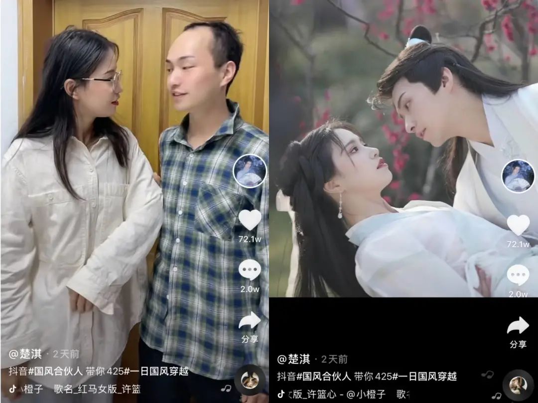 如果説,上述博主的重點還是在展示衣服本身的話,另一類博主則是利用髮型、化妝和美顏濾鏡,通過“邋遢”的現代造型和精緻的漢服造型形成強烈對比,引發關注。抖音博主“楚淇”就是其中一位。從“禿頭大叔”到白面書生,“楚淇”憑藉一頂假髮和一身漢服收穫了700多萬粉絲,每條視頻下面都會出現“這是同一個人嗎?”“能不能把假髮焊死?”等網友的驚歎。