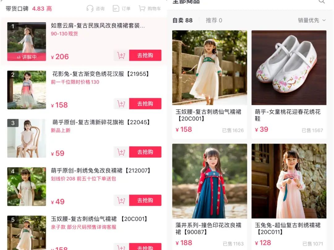 有些商家還盯上了萌娃,在直播間賣起了童裝漢服。抖音賬號“萌乎”的背後就是一家童裝漢服店,商品櫥窗顯示,一條標價158元的襦裙,銷量達1626件,一雙標價39元的繡花鞋,銷量近1600雙。粗略估計,“萌乎”商家僅靠這兩件商品,銷售額就已超30萬元。