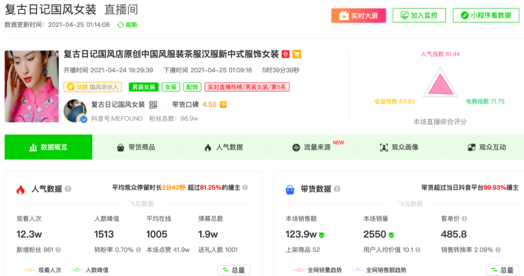 嗅到商機的漢服商家也聞訊趕來。根據飛瓜數據顯示,“復古日記國風女裝”是抖音上眾多漢服直播大軍中的佼佼者。在其4月25日的單場直播中,客單價為480多元,銷量超2500多件,銷售額近130萬元。