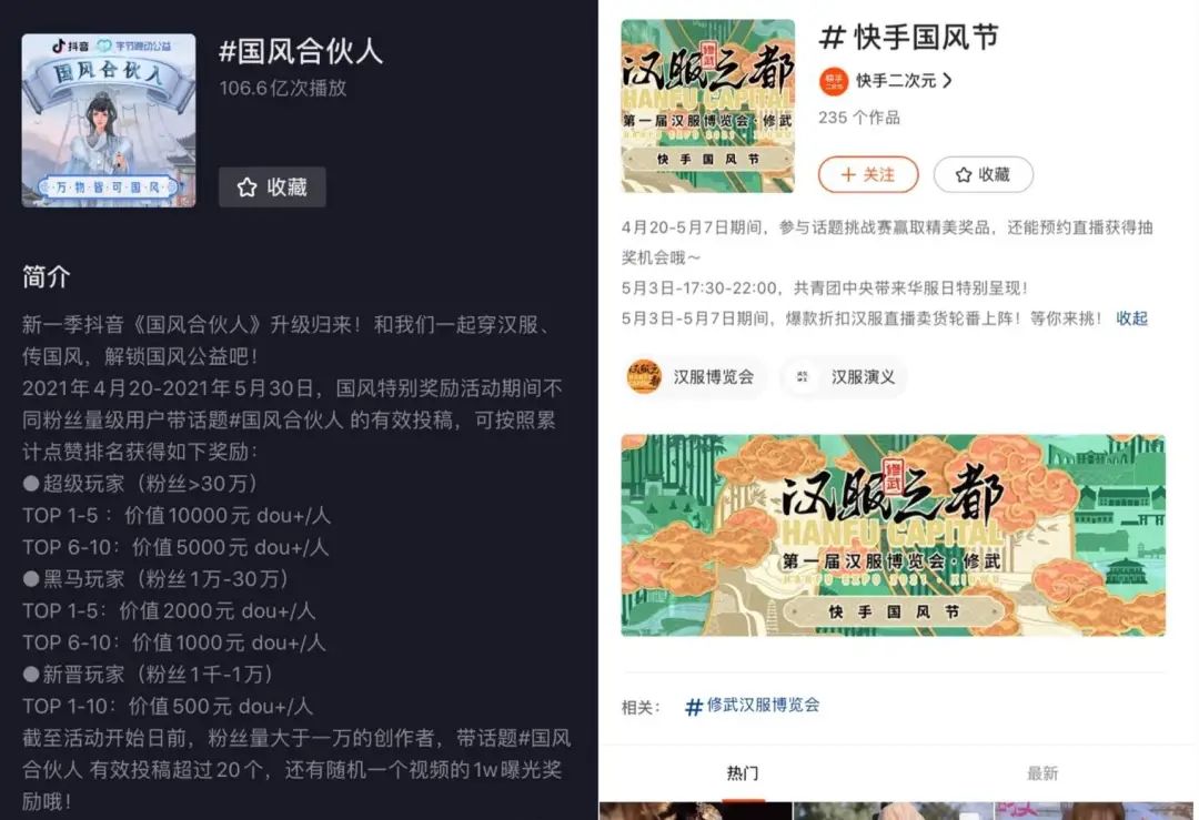 換個角度看,漢服也正在成為短視頻平台搶奪年輕人使用時長的利器。4月中旬,抖音和快手分別開啓了“國風合夥人”“快手國風節”等漢服相關的活動,創作者參與話題挑戰賽,便有機會獲得流量曝光獎勵。