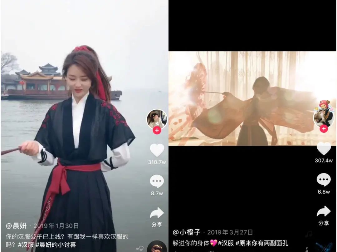 在抖音上的漢服話題中,點贊量最多的,是2019年年初抖音博主“晨妍”拍的一條穿着漢服對口型擺pose的視頻,收穫超300萬的點贊數,“晨妍”是一名穿搭博主,這條置頂的漢服視頻,為她吸粉無數。話題中排名第二的視頻是抖音博主“小橙子”的一條漢服變裝視頻。如今,這兩個博主分別收穫了1300多萬和2550多萬的粉絲。