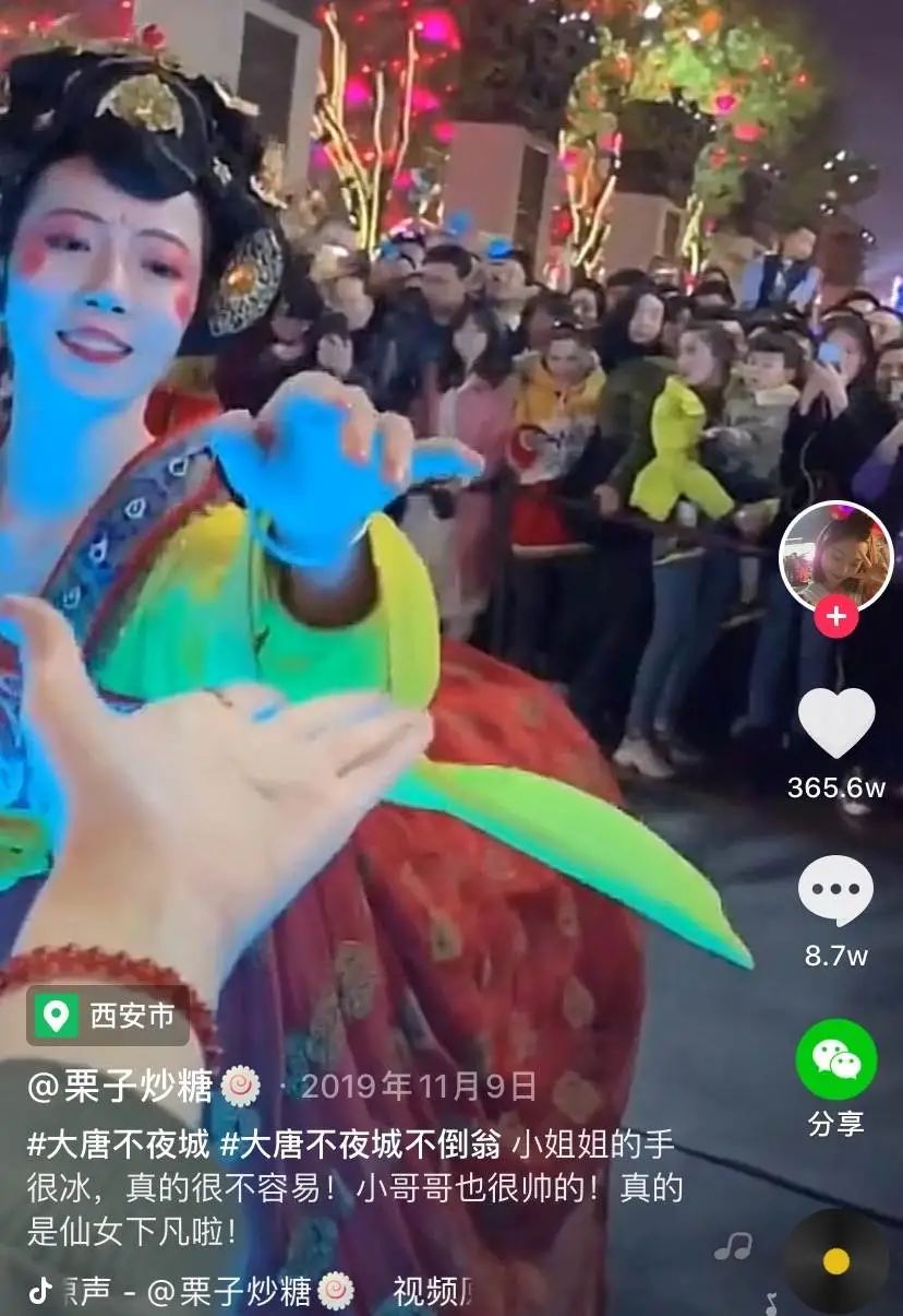 一開始漢服的破圈,其實是一場大型的“文化輸出”活動。2019年,一位去西安大唐不夜城旅遊的網友,在與其他遊客一起圍觀景區內穿漢服的“不倒翁小姐姐”時,恰好拍下了小姐姐伸手過來的畫面,在抖音上收穫了360多萬點贊。越來越多的人聞風趕到西安,都要去小姐姐所在的地方打卡+拍視頻。