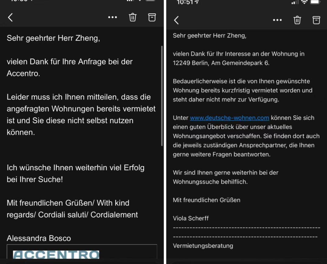 這很快把柏林的租房變成了包含個人陳述的複雜申請:在申請公寓的時候,一般都需要一份申請信和一份申請表格,在信中説清楚自己的情況以及搬家的原因,以及為何想要租這套房子,除此之外,還要想辦法寫出自己的個性,以保障自己能夠從眾多競爭者中脱穎而出。同時,也要做出一些保證,比如不在房間裏抽煙,不在房間裏養寵物。讓房東更瞭解自己的背景。必須的材料還有徵信記錄、銀行流水(我申請時是學生,如果工作了要交工資證明),如果是外國人,最好找前一個房東寫一份推薦信,當然,最後一項理論上也可以不交,但是不交肯定拿不到房子。