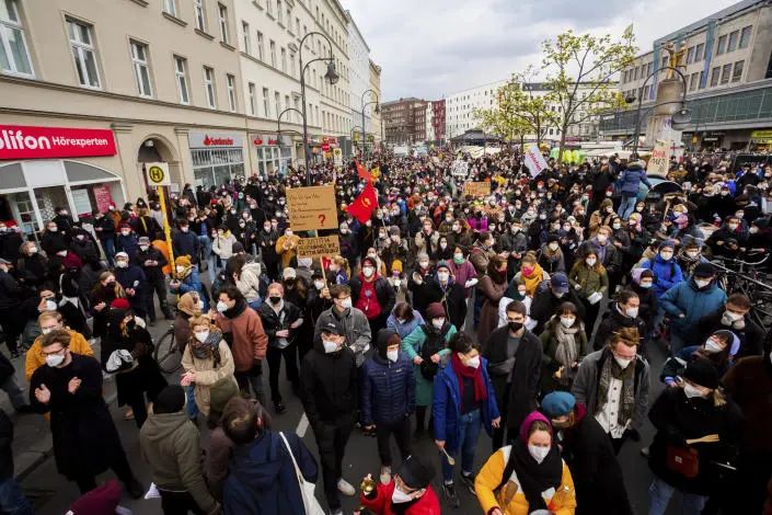 ● 2021年4月15日在柏林街頭的示威集會,抗議法院取消租金封頂政策的裁決。/ AP
