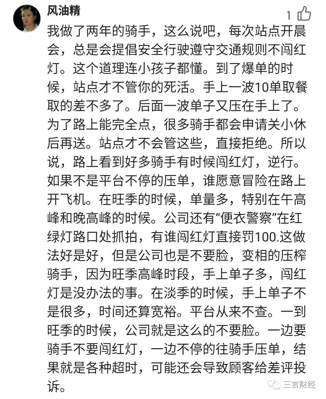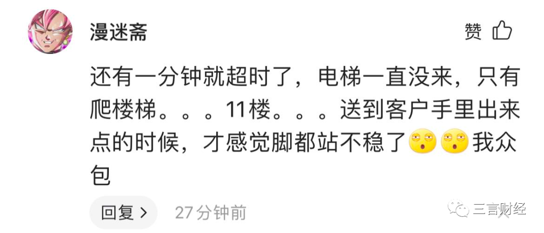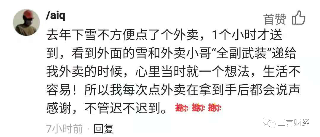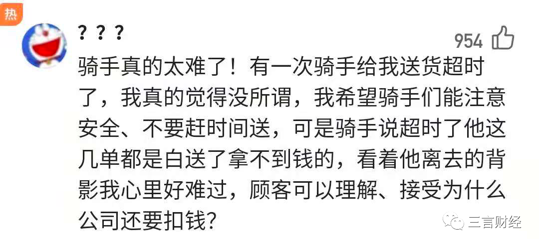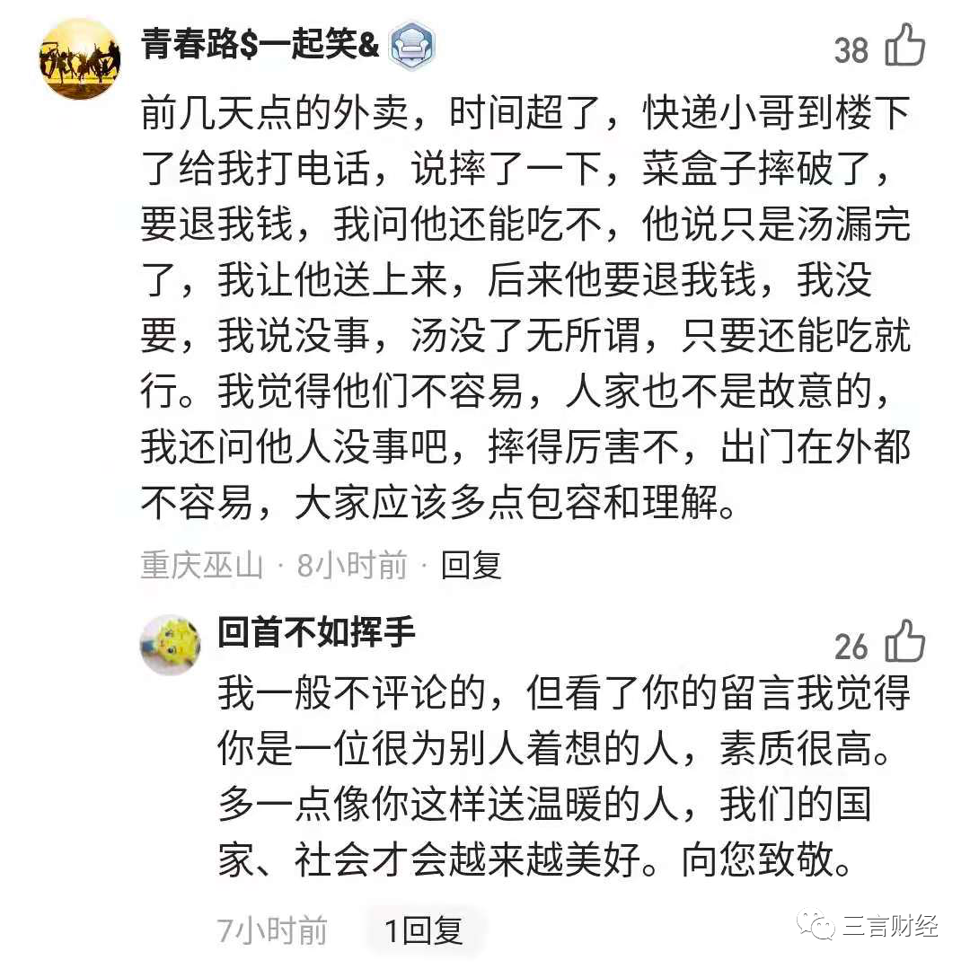 還有一位網友講述了自己的親身經歷,一次一個騎手送餐超時,餐還被撒了,當時騎手十分緊張,又道歉,又要退錢。