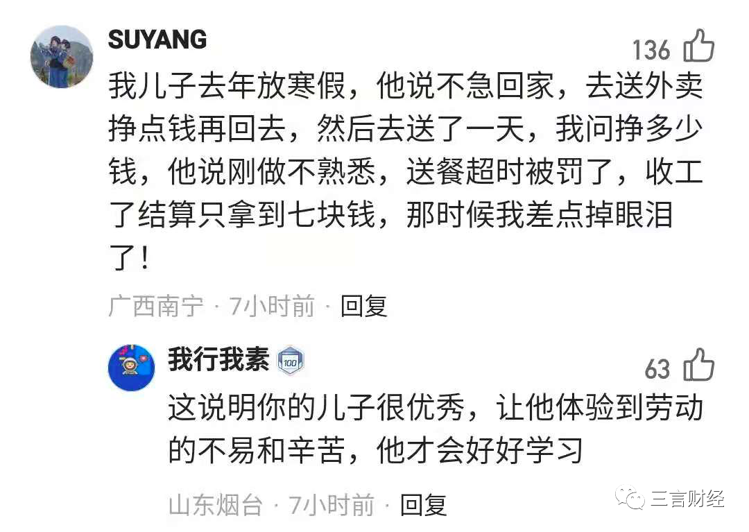 有網友指出,自己兒子去年放寒假時,為了想掙點錢再回家,就去送了外賣。