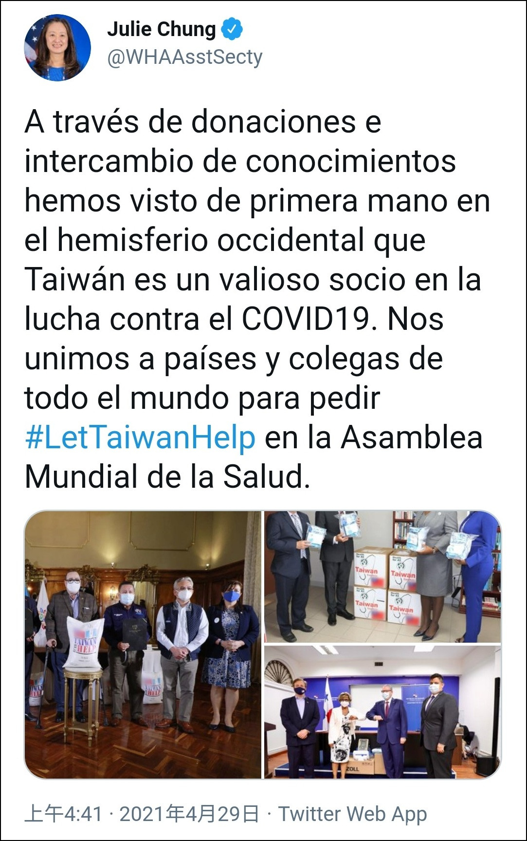 4月29日,美國國務院西半球事務局代理助理國務卿Julie J. Chung亦發文參與。