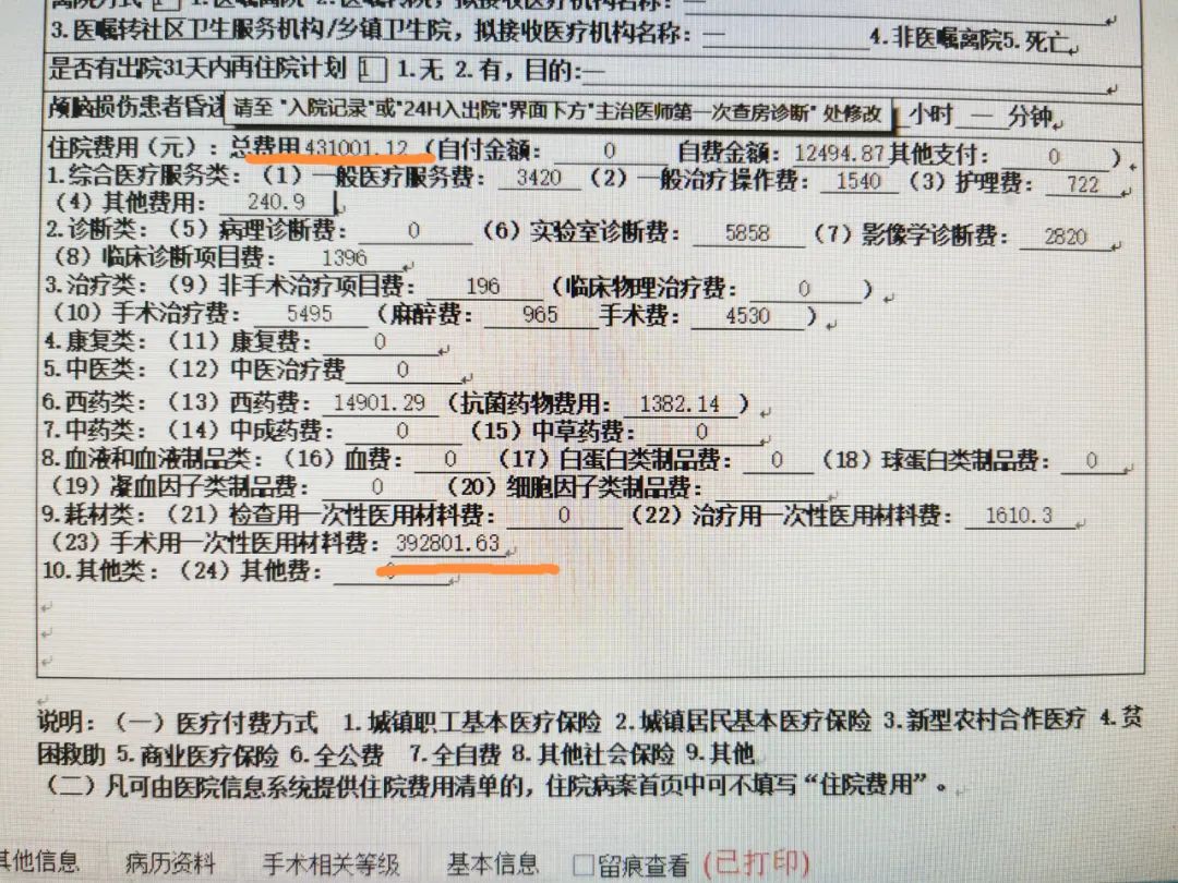 我找了一個胸腹主動脈夾層的病人,發現他的整個住院費用是43萬,而手術一次性材料的費用就達到了39萬。