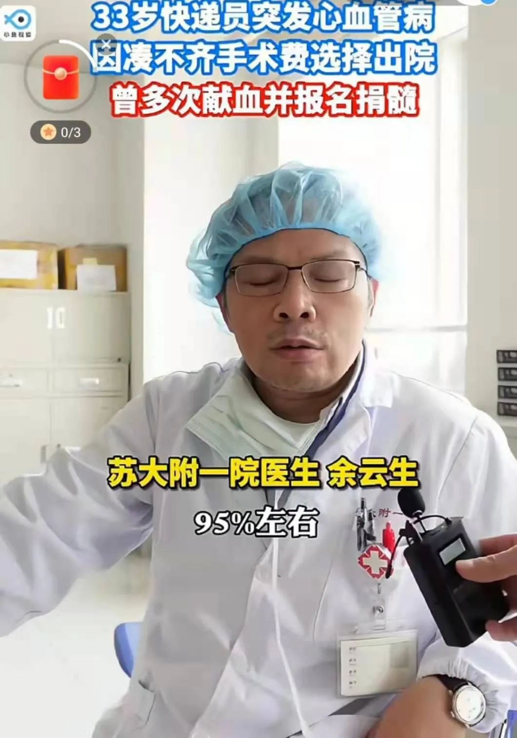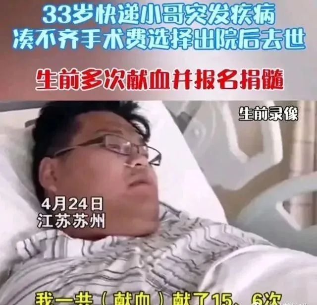 講的是蘇州一個33歲的快遞小哥,生了急症,急需手術治療,手術費要40萬,結果家裏出不起這麼多錢,給他辦了出院,之後不幸死在家中。