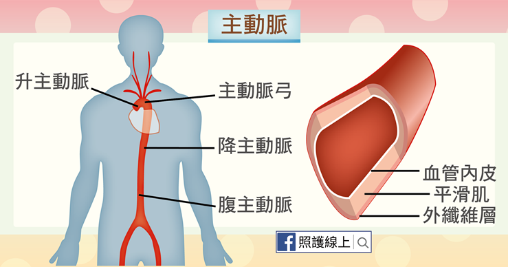 簡單科普一下。主動脈是人體最大的血管,是跟心臟連接的血管,也是血液運輸的主幹道。主動脈彈性很高,能夠把血液運到外周血管,同時在心臟舒張期通過回彈,讓血液繼續流動。人體的主動脈可以分為升主動脈、主動脈弓、降主動脈、腹主動脈,主動脈分為三層,內膜、中層、外膜。