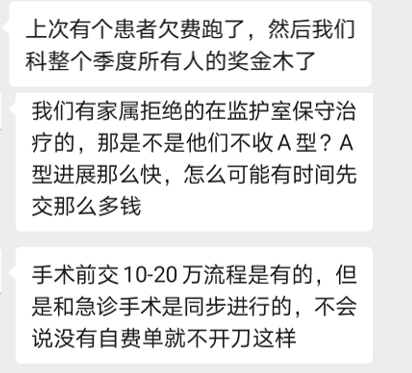 事實上,醫生真的沒法從支架裏拿錢。反而,他們會盡力幫助沒有錢的患者。我的兩位朋友,一個是頂尖心血管醫院的血管外科醫生,他説也不會讓病人交全款,也不是不給做手術,一般病人能交個20萬,就開刀了。另一個是頂尖三甲醫院的心臟外科醫生,她説如果遇到A型夾層,也不會非交錢再手術,而是緊急手術,聯繫家屬交費。反而有一次,一個病人治好了偷偷跑了,留下幾十萬沒結賬,結果整個科室一個季度的獎金都取消了。