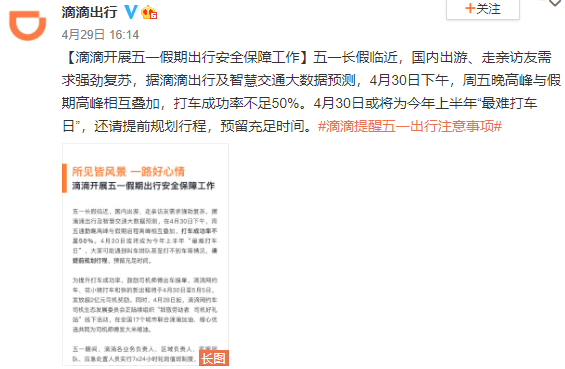 滴滴出行發佈預測,由於週五通勤晚高峯及假期啓程高峯疊加,打車成功率不足50%,今天下午或將成為今年上半年“最難打車日”。滴滴呼籲,請提前規劃行程,預留充足時間。