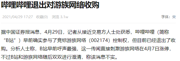 嗶哩嗶哩早前確實參與了競標遊族網絡控制權,但目前已經退出了收購。