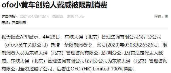 小黃車ofo創始人兼CEO戴威再被限制高消費。
