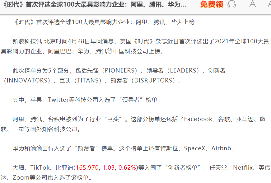 美國《時代》雜誌近日首次評選出了2021年全球100大最具影響力的企業,阿里巴巴、華為、騰訊等中國科技公司上榜。