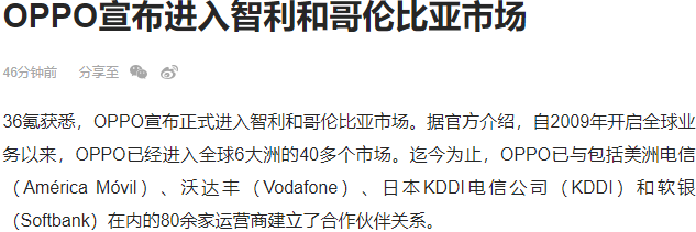 OPPO宣佈正式進入智利和哥倫比亞市場。據官方介紹,自2009年開啓全球業務以來,OPPO已經進入全球6大洲的40多個市場。