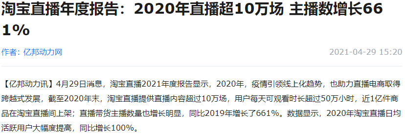 淘寶直播2021年度報告顯示,截至2020年末,淘寶直播提供直播內容超過10萬場,用户每天可觀看時長超過50萬小時,近1億件商品在淘寶直播間上架;直播帶貨主播數量也增長明顯,同比2019年增長了661%。