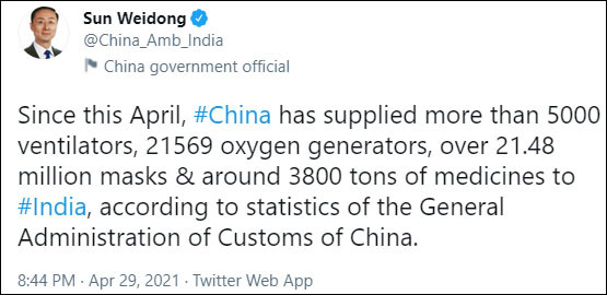 印度深陷疫情風暴,中國也伸出了援手。當地時間29日,中國駐印度大使孫衞東在Twitter發帖,透露4月以來,中國已向印度提供了5000多台呼吸機、21569台製氧機、超過2148萬個口罩以及超過3800噸的藥品。